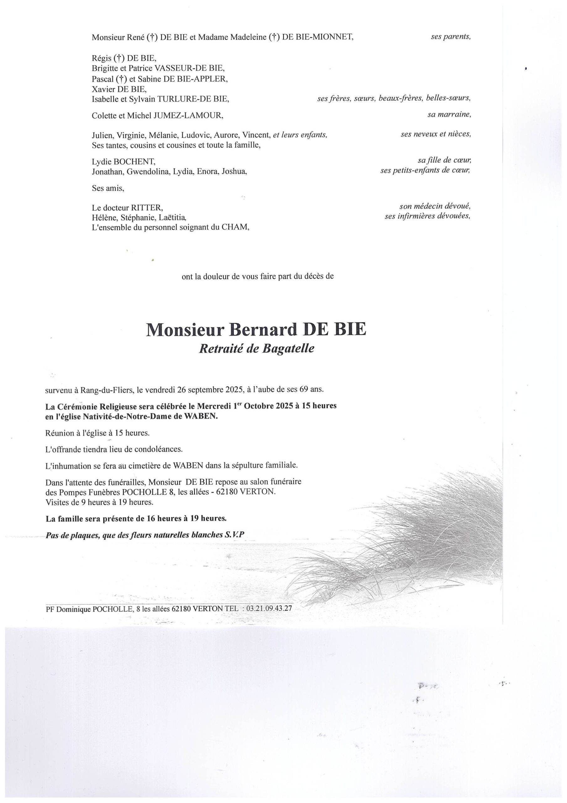 A toute la famille de Mr De Bie:Je m'associe à votre peine et vous présente mes plus sincères condoléances.viviane Rochet (ADMR)