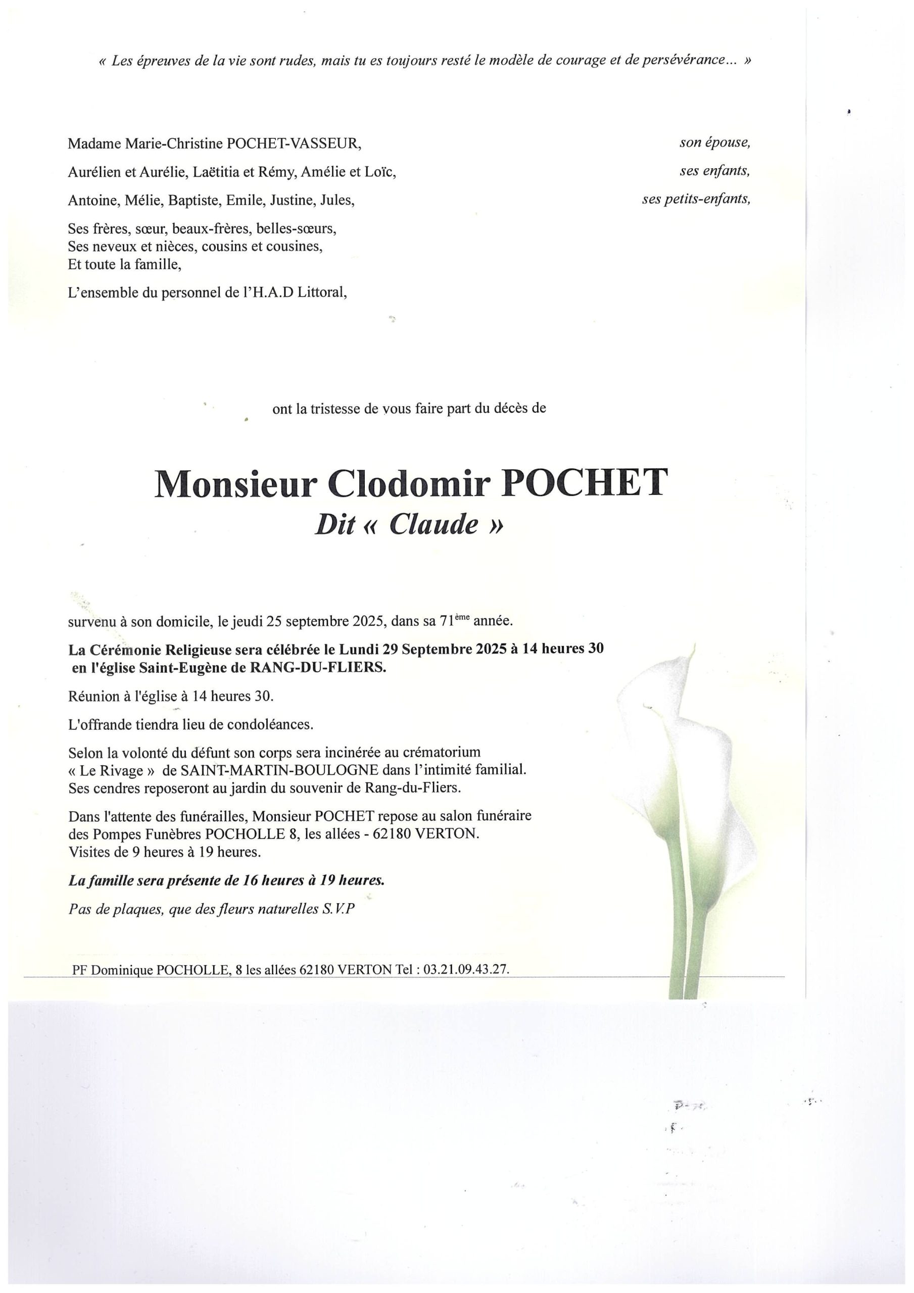 Ne pouvant assister aux obsèques de Clodomir, nous vous présentons nos sincères condoléances.
