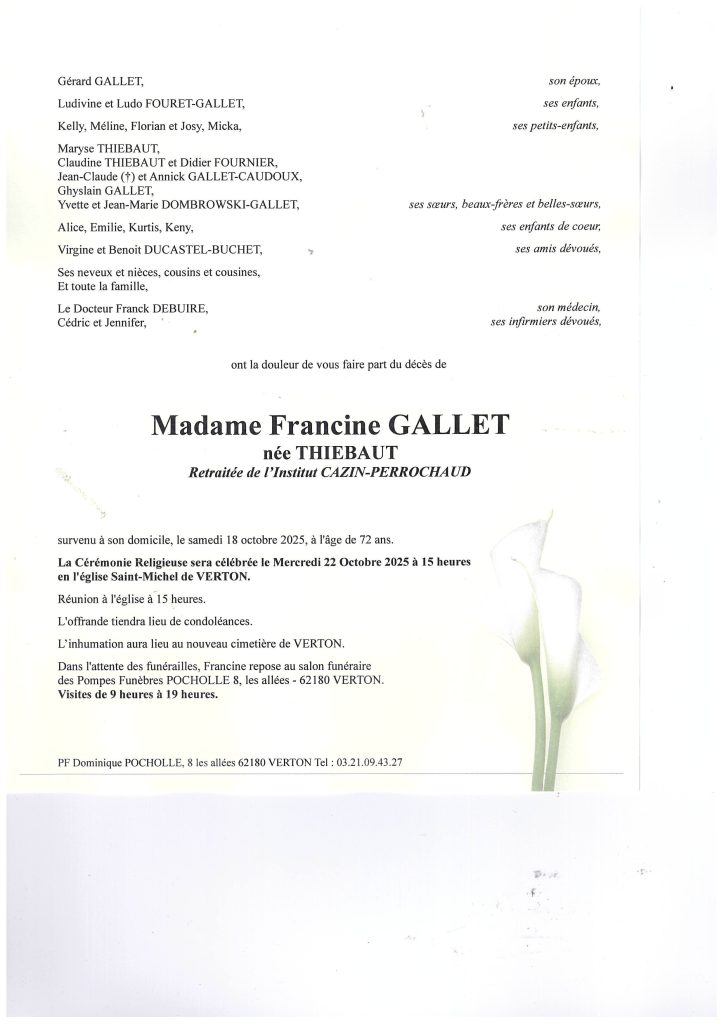 Anne & Pascal Ternisien présentent à la famille de Madame Francine Gallet leurs sincères condoléances.