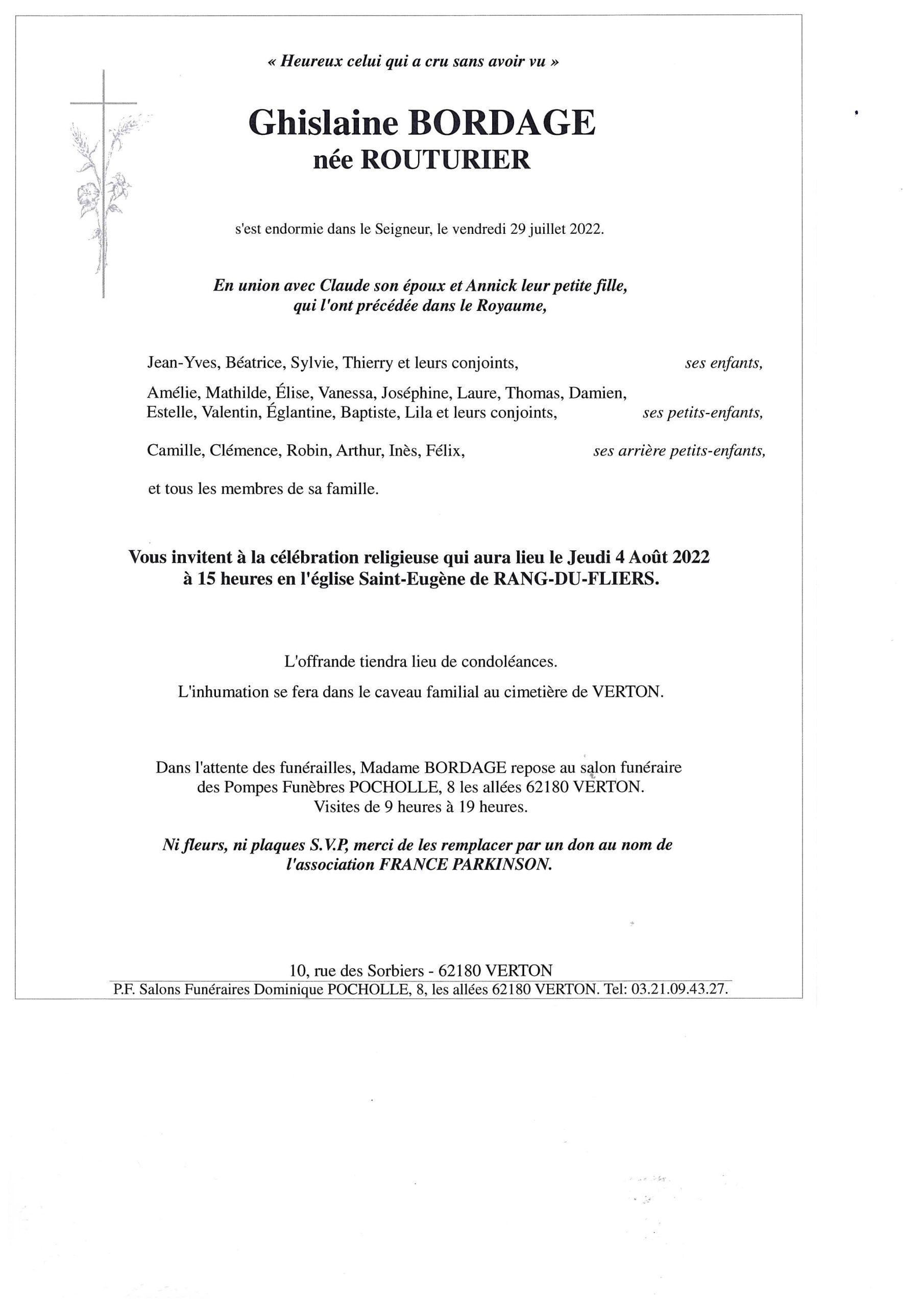 Sincères condoléances à toute la famille.Elue municipale à Verton, j'ai rencontré Mme Bordage lors du portage du colis des ainés, je garde un bon souvenir de son accueil. Marie-Claude Chieus