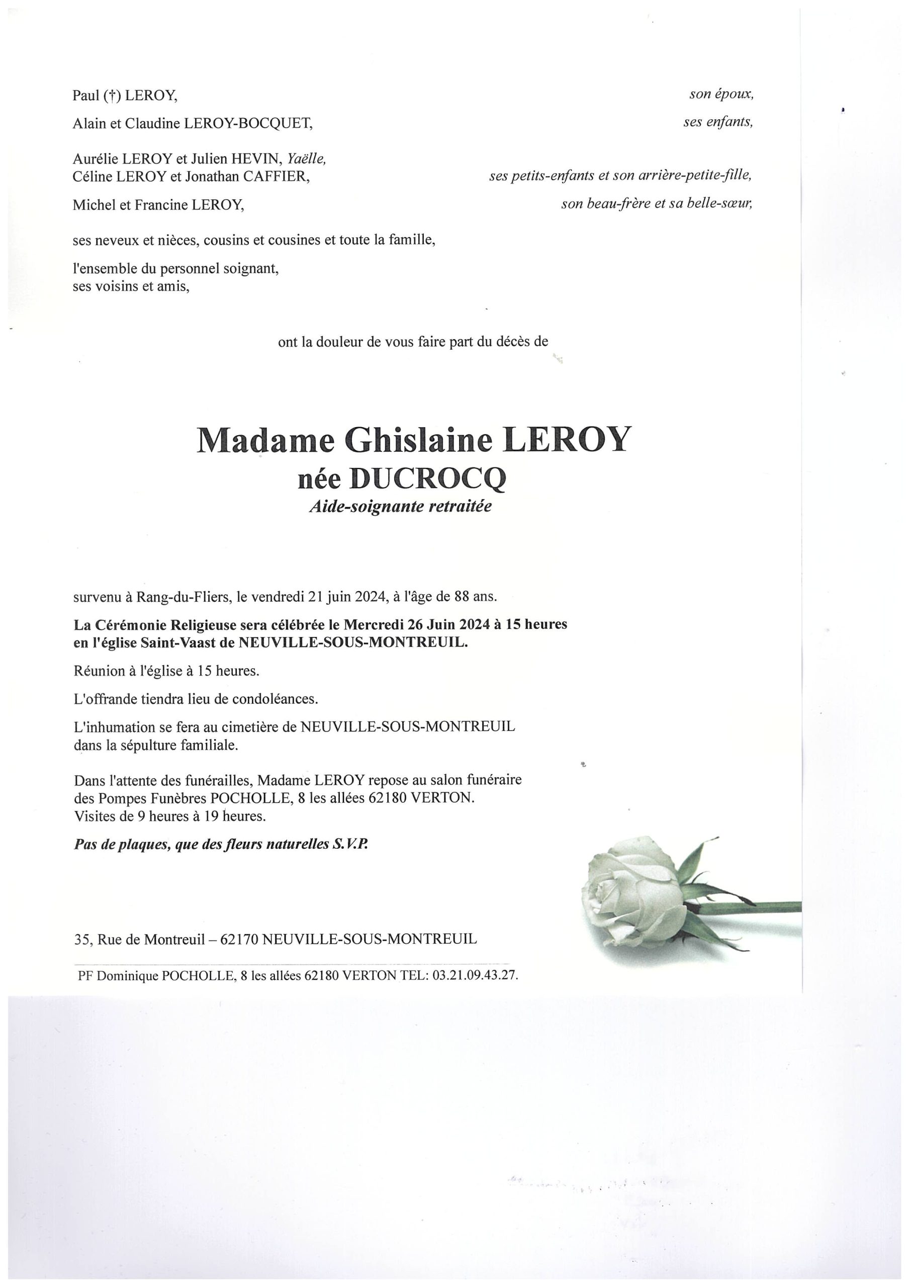 SINCERES CONDOLEANCES A ALAIN ET TOUTE LA FAMILLE BEAUCOUP DE SOUVENIRS A NEUVILLE QAND J ETAIS ENFANT JE PASSAIS LES VACANCES SCOLAIRES CHEZ MA GRAND Mère ET J ALLAIS AVEC MA COUSINE CHEZ CHRISTINE LEROY SA COPINE ET ALAIN ETAIS LA MA GRAND Mère HABITAIS LA MAISON DE GUY TRUPIN GHISLAINE ETAIS UNE BONNE PERSONNE CLAUDIE JEROME EPOUSE DELATRE 16 RUE NICOLE BERCK