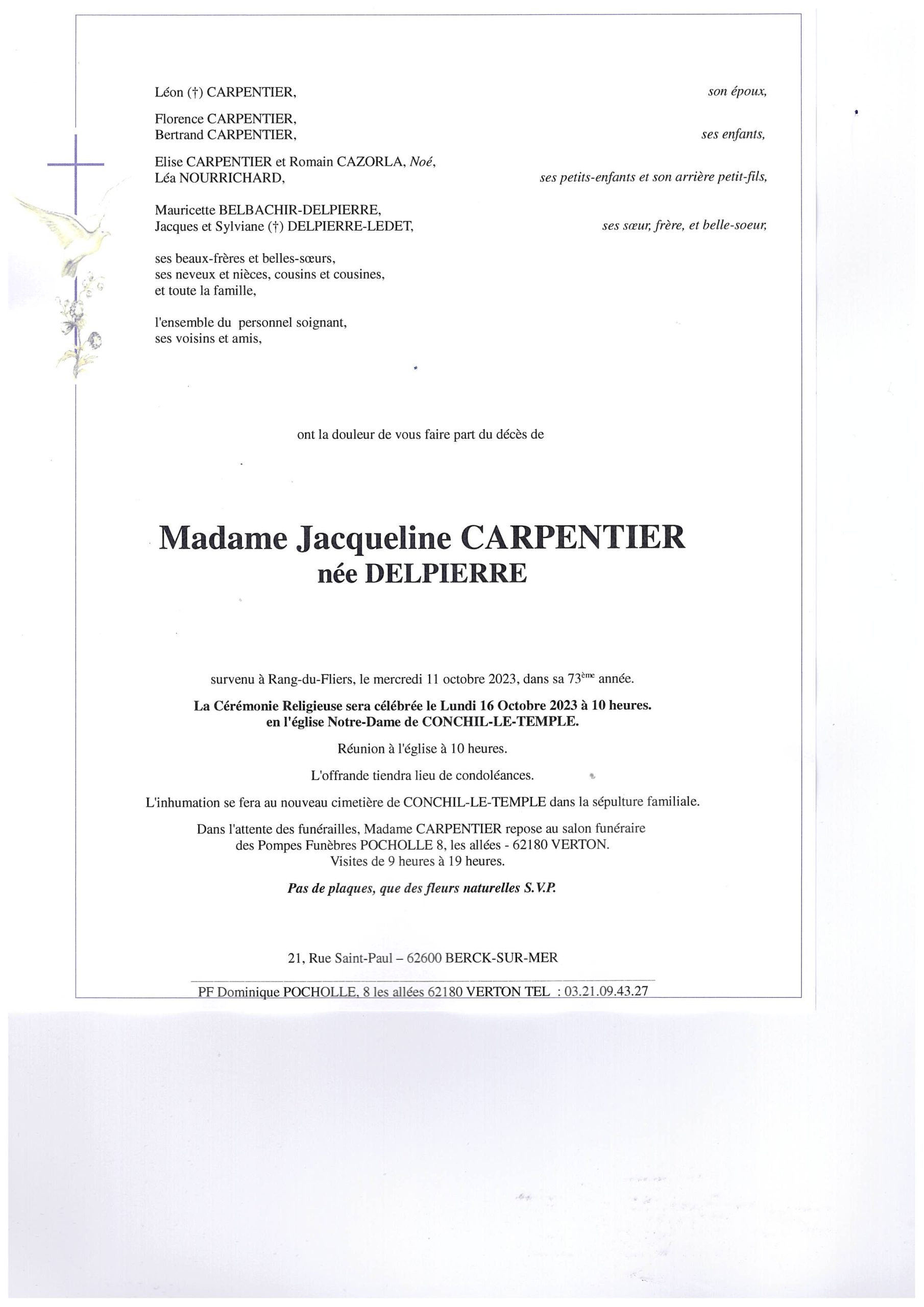 Mr et Mme Winter Francis présentent à la famille de Mme Carpentier ses plus sincères condoléances et partagent votre peine