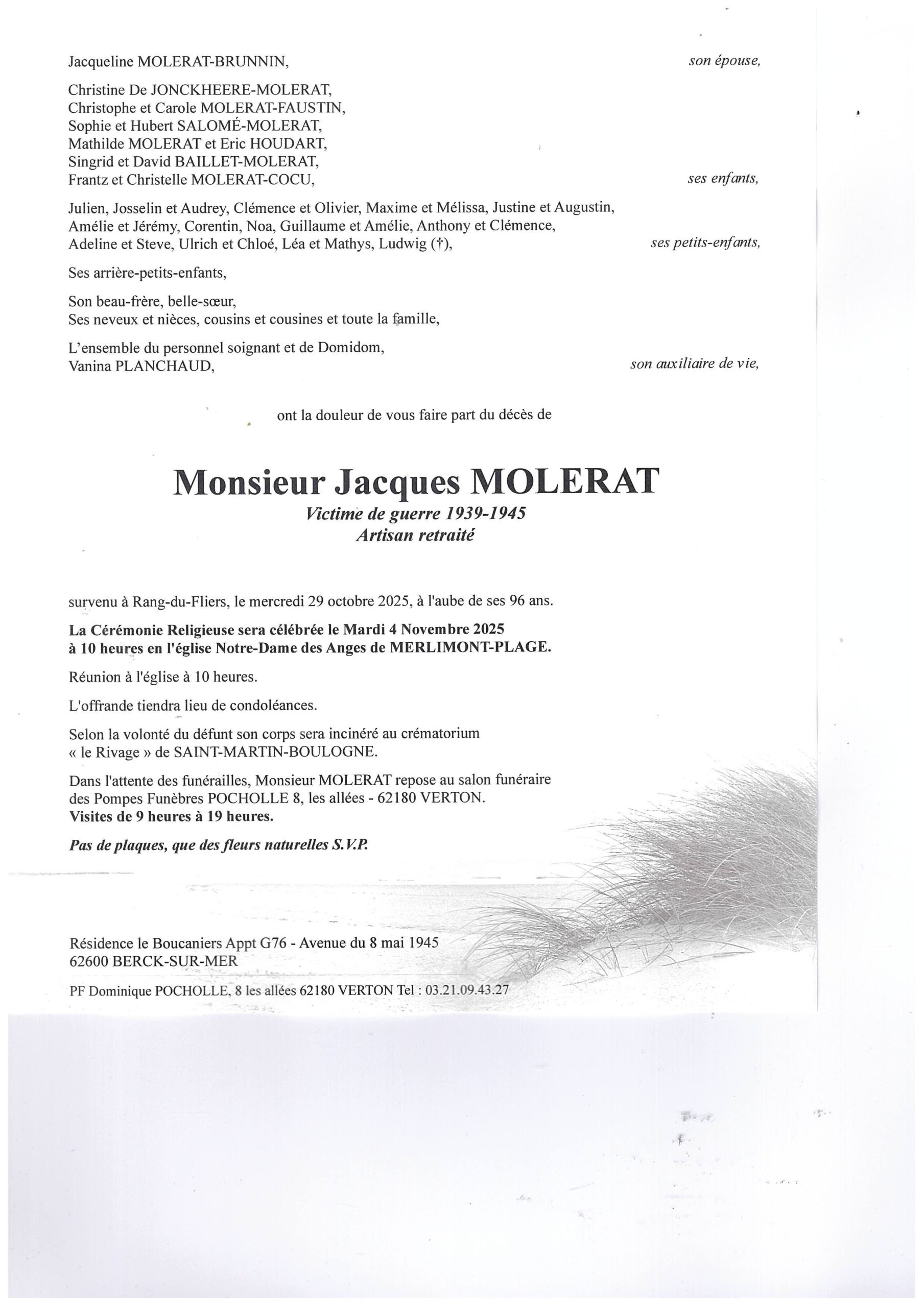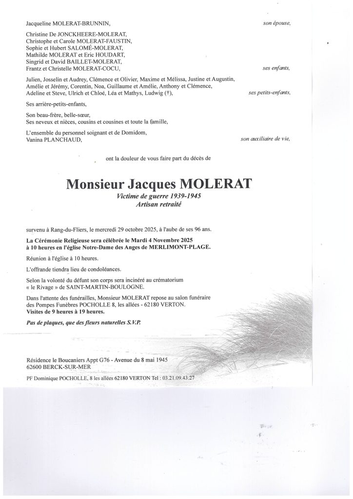 A Mme MOLERAT, les enfants et toute la famille, nous vous présentons nos très sincères condoléances, en vous souhaitant beaucoup de courage. Désolés de n'avoir pu assister aux funérailles. Adelin SAUVAGE et Rose TREUNET - Merlimont
