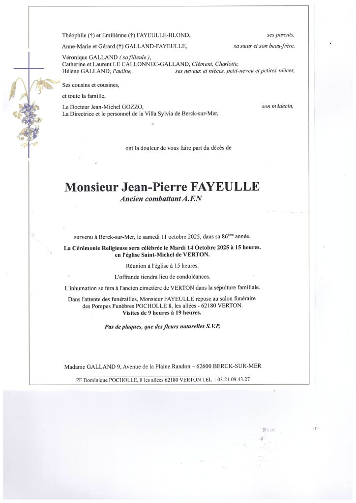Nous vous présentons nos sincères condoléances. Mr et Mme BODART voisins de Mr Fayeulle.