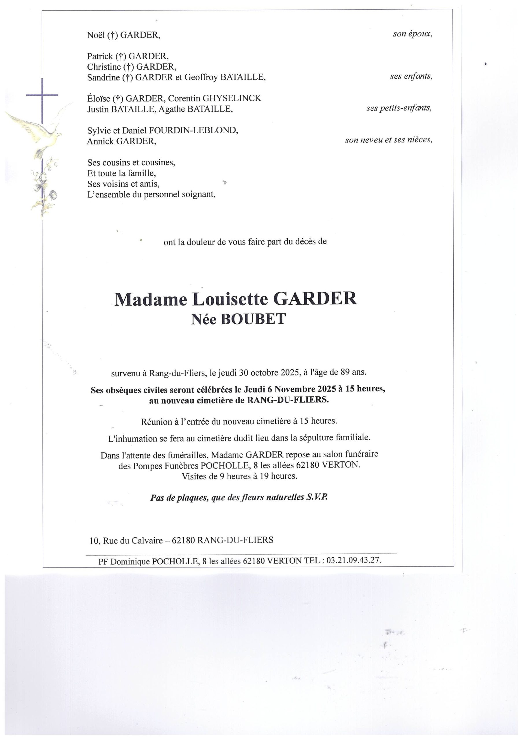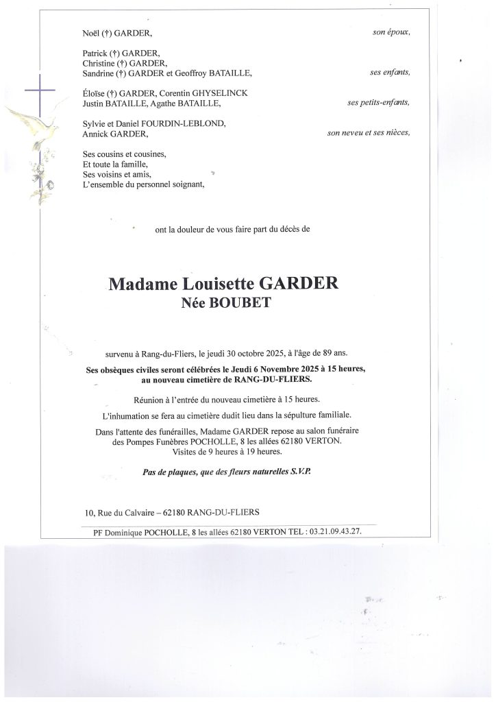 Au revoir Madame Garder. Vous et Sandrine m'avez bien souvent dépanné en gardant ma fille Elodie lorsqu'elle était enfant , Je ne vous oublierai pas et conserverai de vous l'image d'une femme discrète solitaire et serviable. Condoléances à la famille Sylvie et Didier Roussel