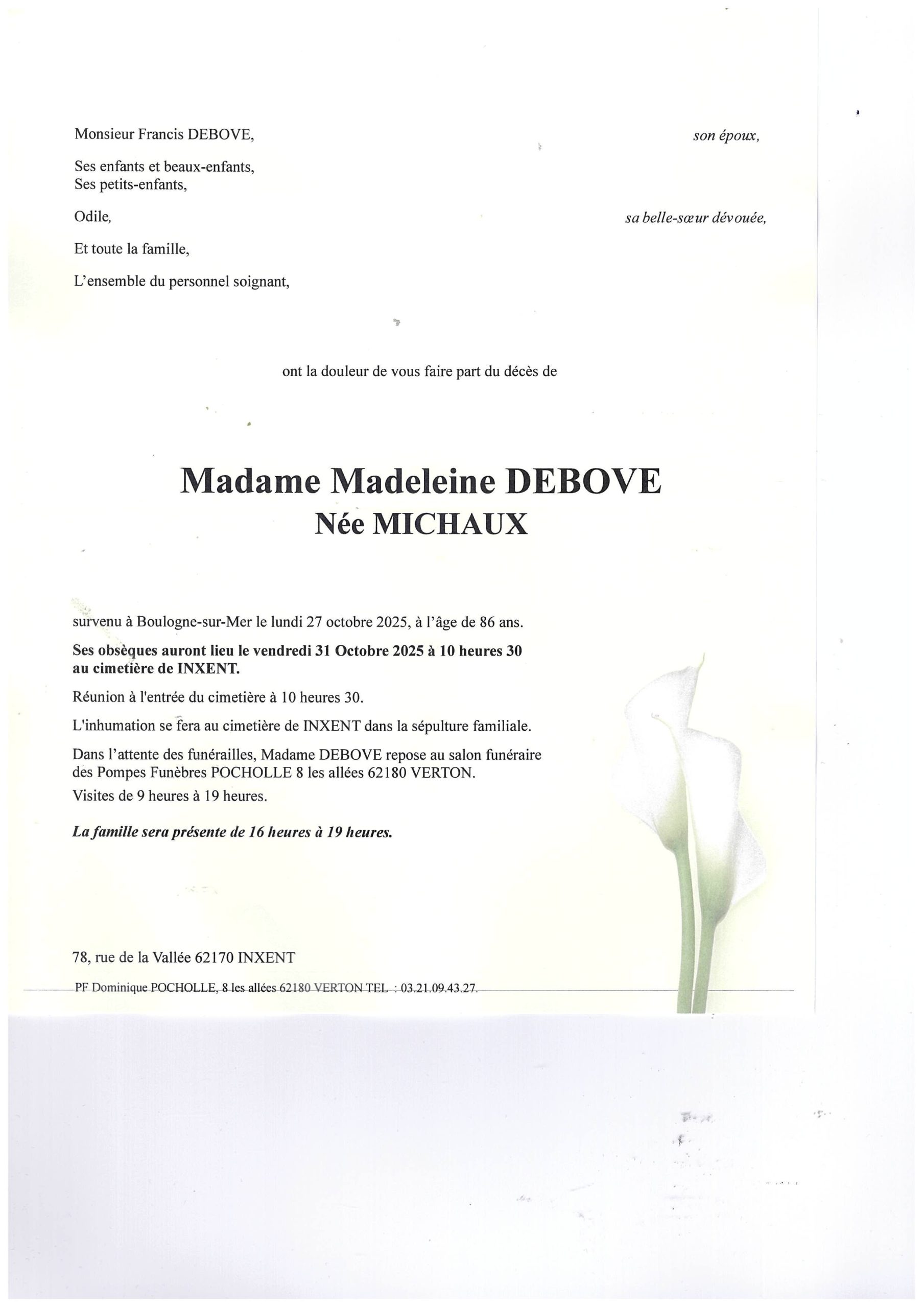 J adresse mes plus sincères condoléances à la famille de Mme Debove M et vous prie dr croire en toute sa sympathie.