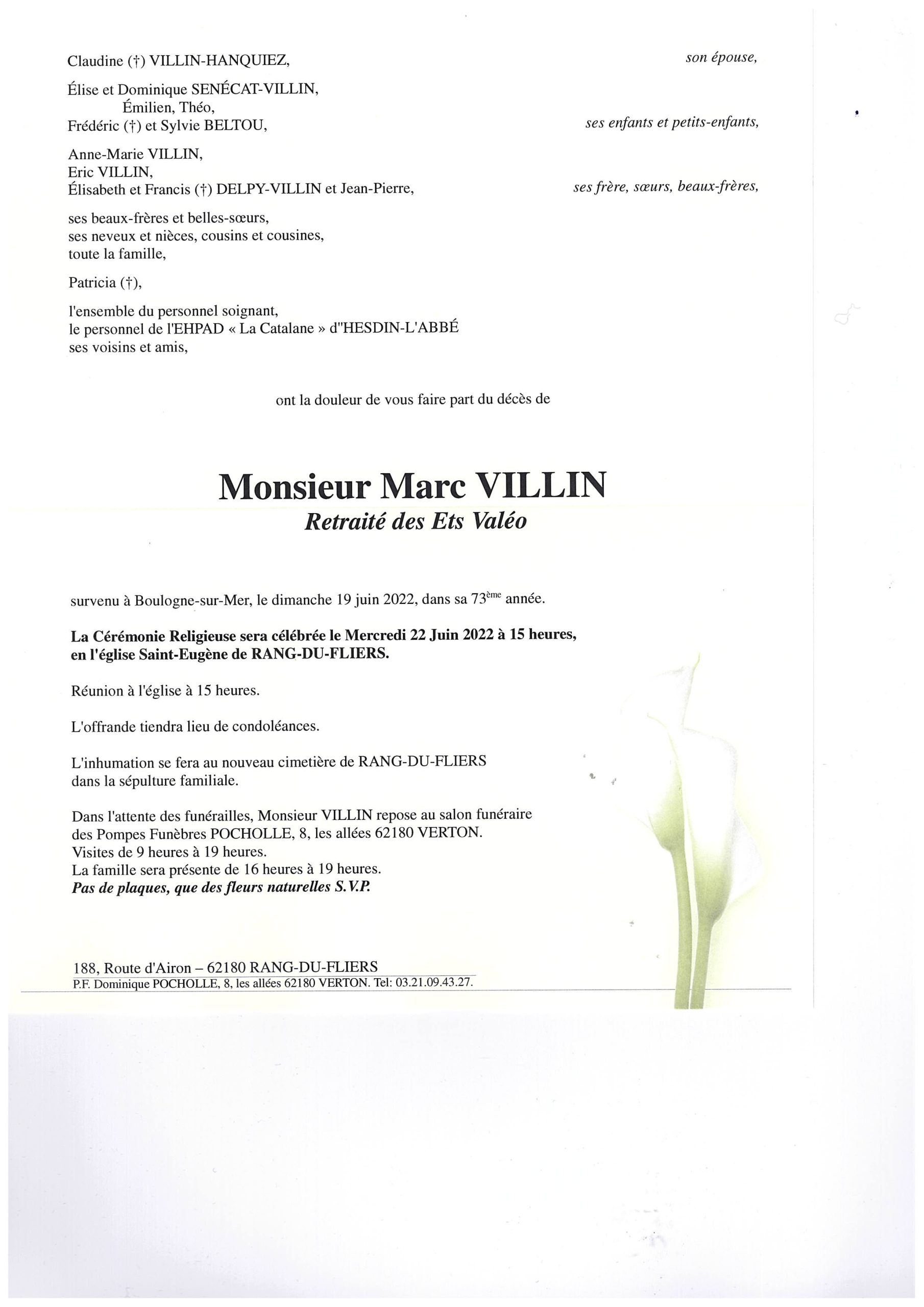 Un regard, un geste, une présence ,des fleurs, tous les témoignages d'amitié en ces jours d'épreuves lors du départ de mon père M Marc Villin nous ont apporté à moi et à mes proches réconfort . Nous vous en remercions vivement.