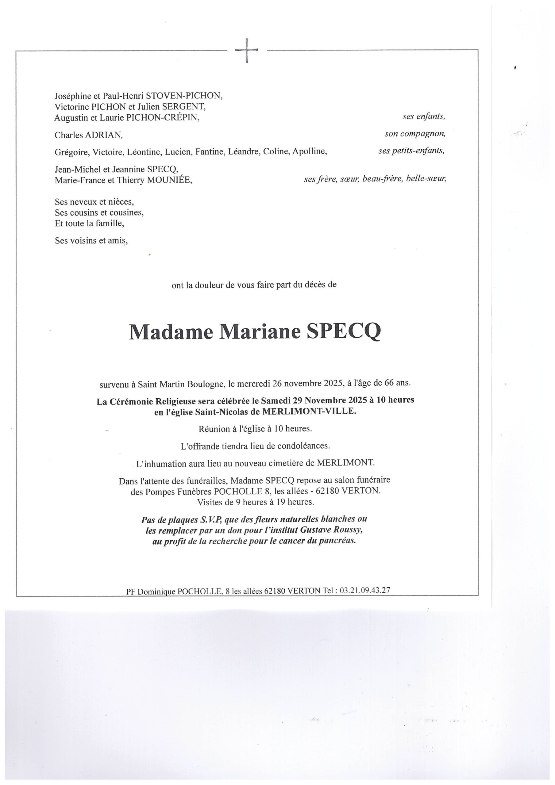 Mes condoléances au compagnon, aux enfants et petits enfants, à toute la famille. Je viens d'apprendre la triste nouvelle et pense à,Mariane, Marie-France, Philippe et aux souvenirs de jeunesse au siège de lEssm. Que Mariane repose en paix. La maladie a été plus forte. Mchristine Deleau