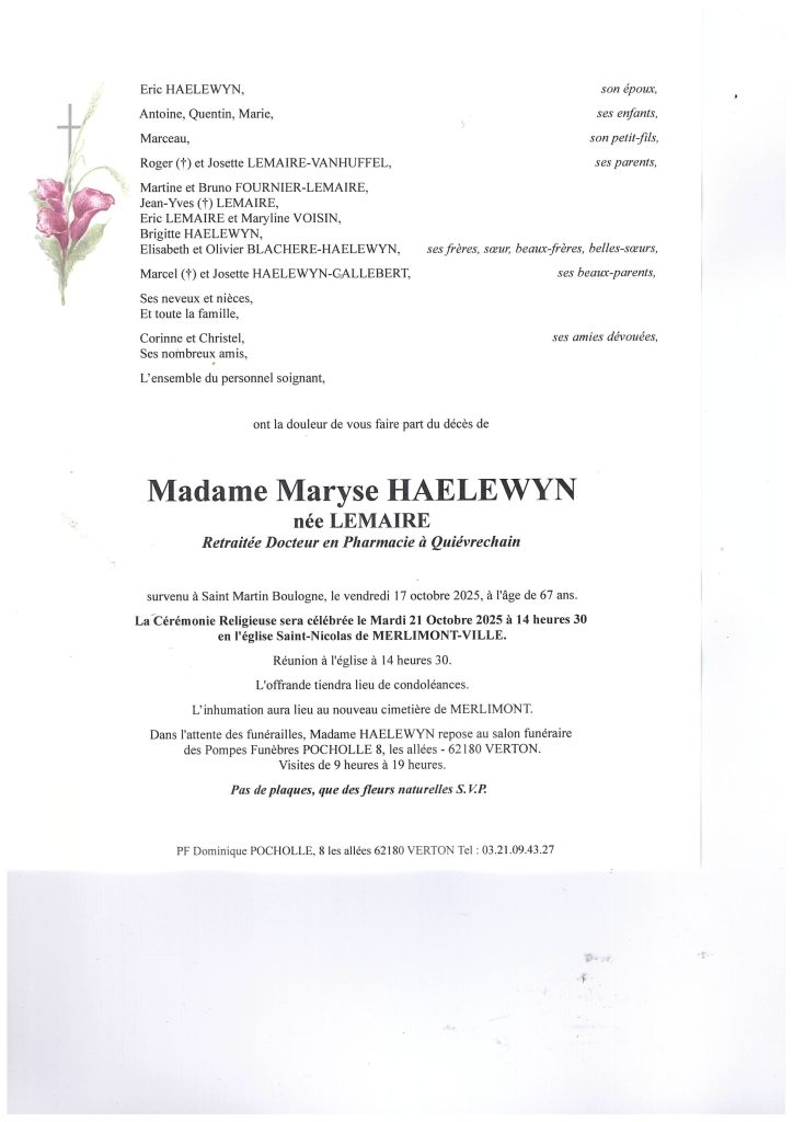 Je vous présente mes plus sincères condoléances, beaucoup de force et courage dans cette épreuve. Jamais je ne l oublierai..reposez en paix Madame Haelewyn.