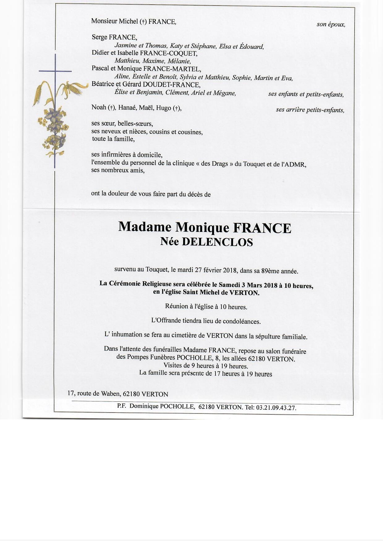 Nous sommes désolés de n'avoir pu assister aux obsèques de Mme France, étant absents. Nous prenons part à votre douleur et vous présentons nos très sincères condoléances.