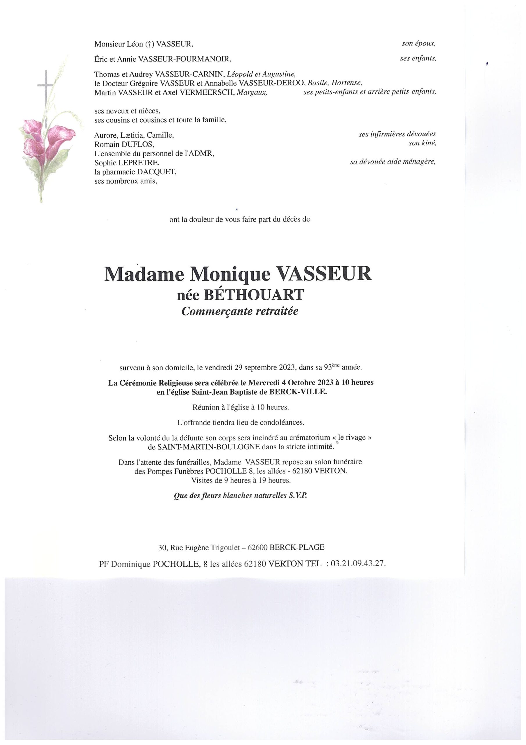Toutes nos condoléances à la famille de Mme Vasseur.Mme Pierru Ducrocq M.Therese ses enfants.