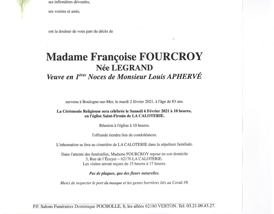 décédée à VERTON le lundi 11 octobre 2021 à l’âge de 84 ans. l’incinération à eu lieu au crématorium « le rivage » de SAINT MARTIN BOULOGNE