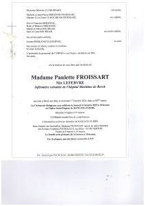 Toutes mes condoléances pour le décès de Paulette. N'étant pas à Merlimont actuellement je ne serai pas à la messe avec beaucoup de regrets. Je vous souhaite beaucoup de courage et pense beaucoup à samy qui avait une adoration pour sa grand mère Anne Marie rivet tanfin