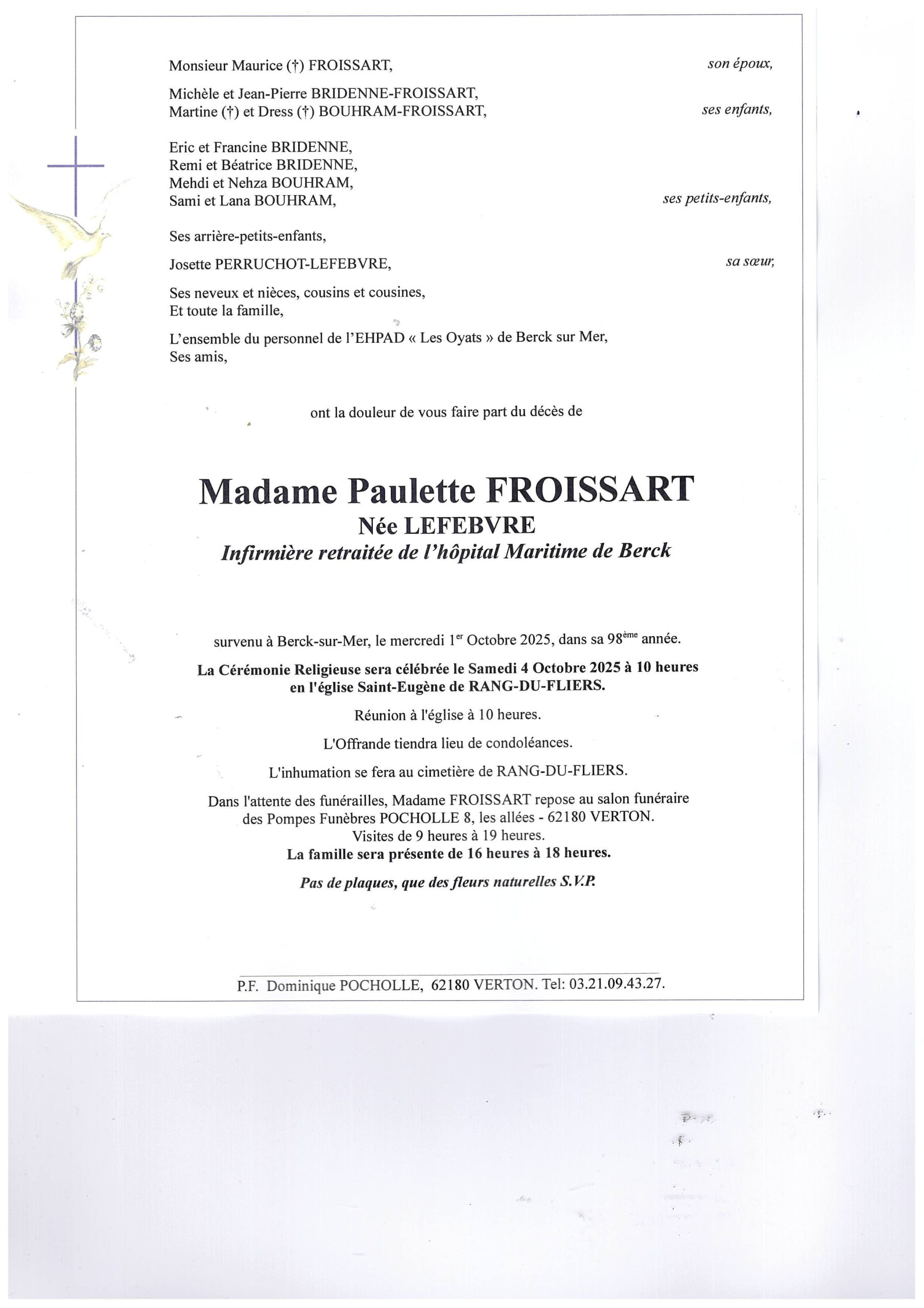 La Présidente, Le Conseil d'Administration et l'ensemble du personnel de l'association ADMR de Rang du Fliers vous présentent leurs sincères condoléances.