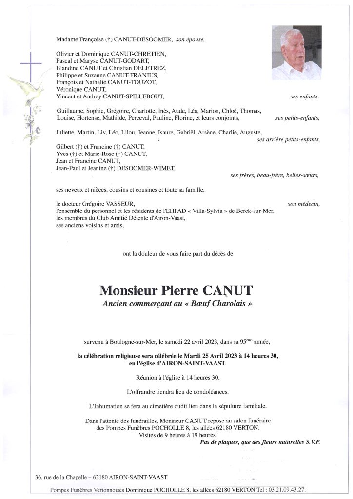 Mes sincères condoléances à la famille de Pierre CANUT. Il a longtemps fait partie de la société de Chasse d'Airon St Vaast et, en tant qu'ancien artisan boucher-trraiteur, il a activement participé à la préparation du repas de chasse annuel.