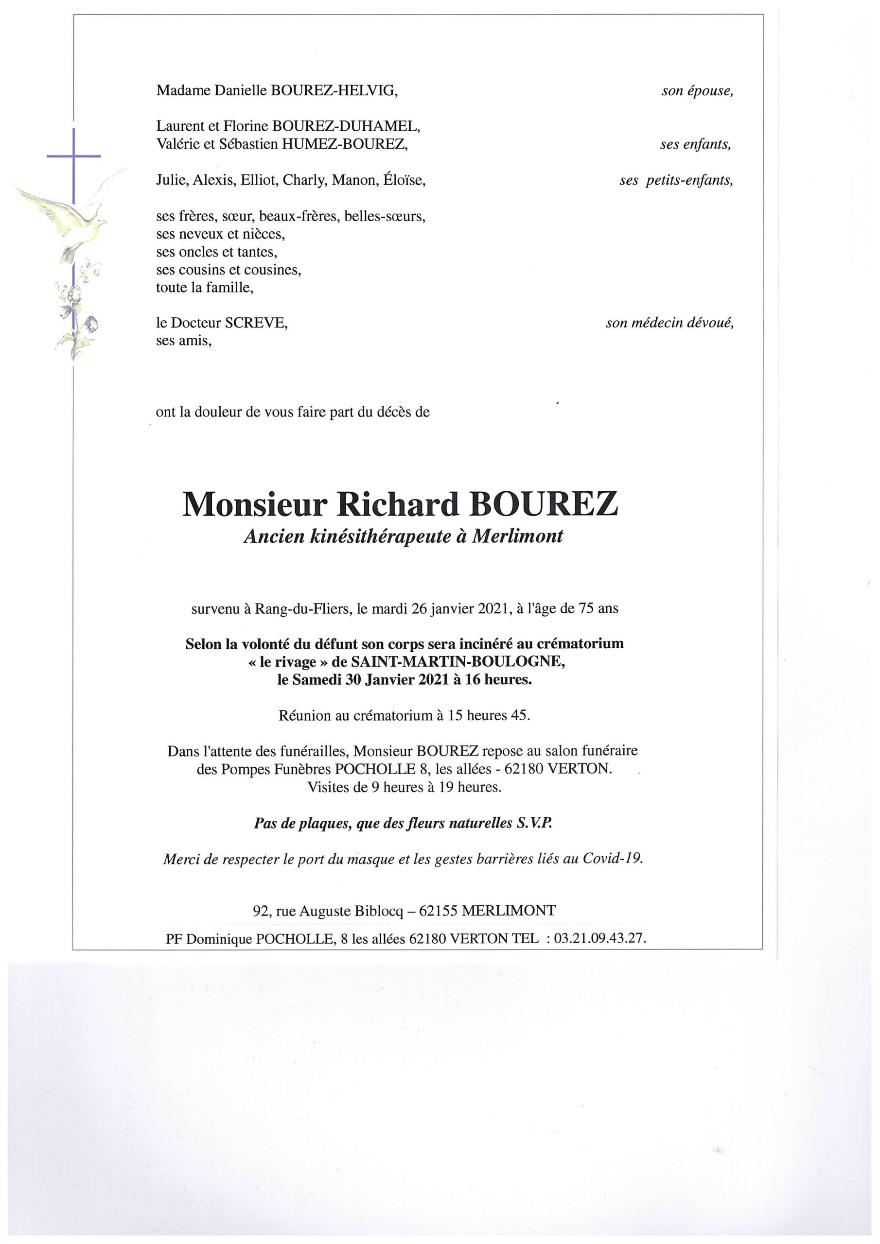 Mr BOUREZ a été d'un grand professionnalisme, particulièrement attentif pour ma sœur Francine qu'il a su réconforter durant de nombreuses années, Recevez. Madame mes biens sincères condoléances , qu'il repose en paix.