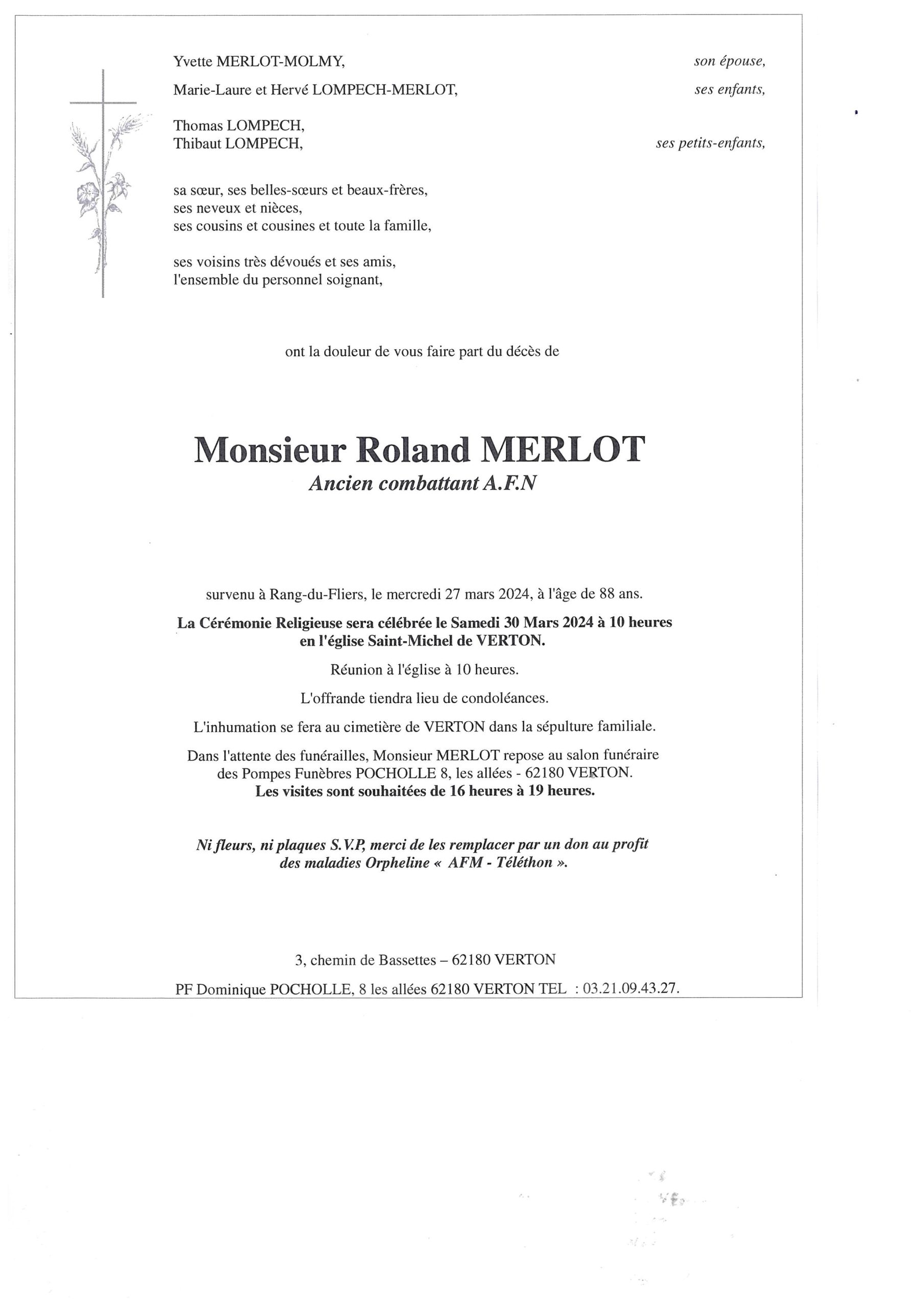 Étant apcents nous n'avons pu assister aux obsèques de Mr Merlot nous présentons nos sincères condoléances à la famille Mr et Mme Beauvisage Alain 72 allée des marguerites Verton