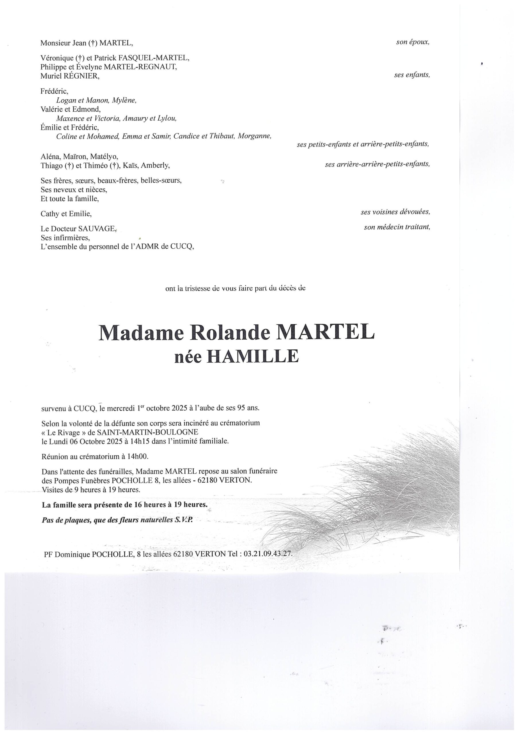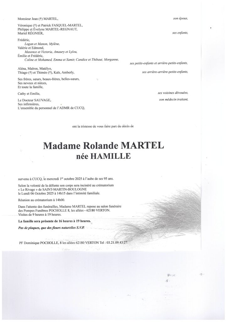 J adresse mes plus sincères condoléances à la famille de Mme Martel. Et vous prie de croire en toute ma sympathie.